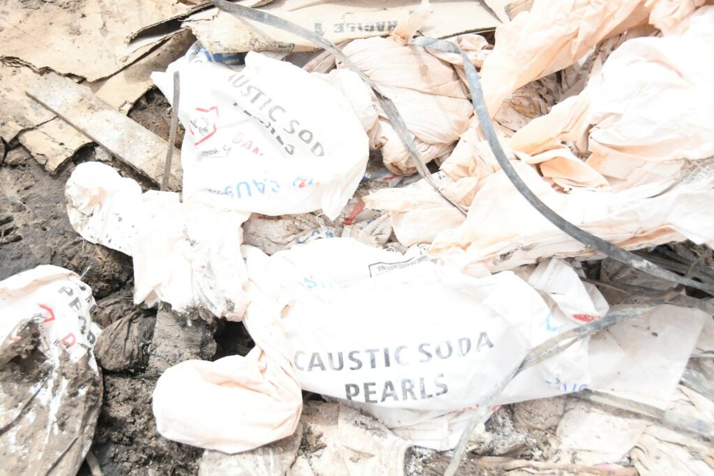 Poursuivant leurs investigations, les éléments de la Police de l’Environnement ont réussi à remonter la filière jusqu’à une entreprise située à Loumbila. Sur les lieux, les constats effectués se sont révélés particulièrement préoccupants. Présence de résidus de cyanure, dépôts anarchiques de déchets, y compris médicaux, et exposition de substances dangereuses à l’air libre.